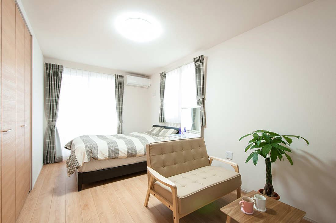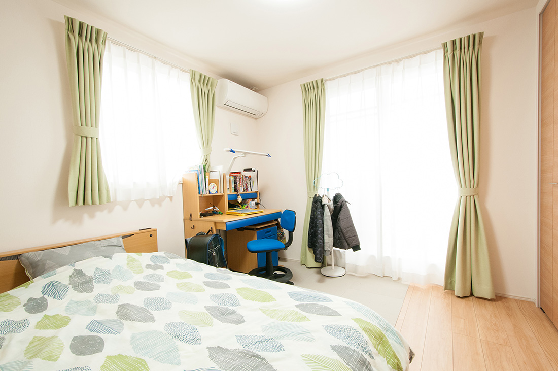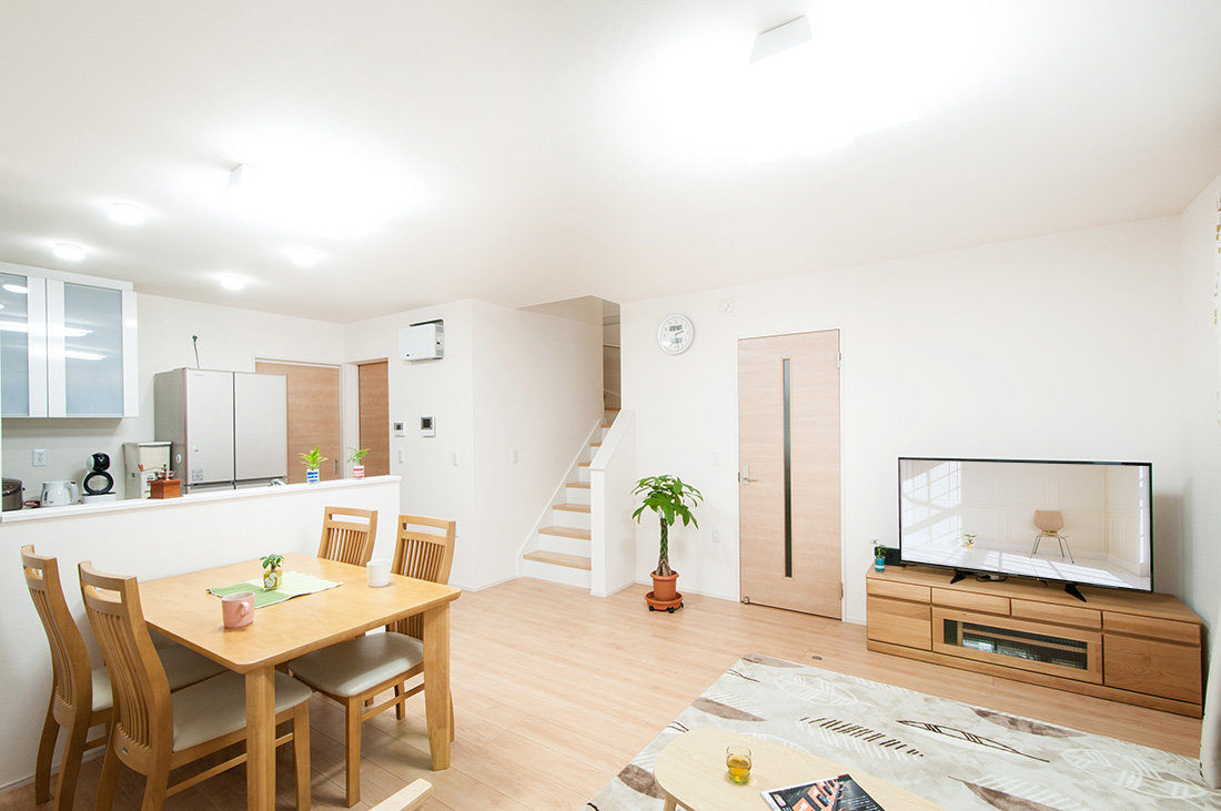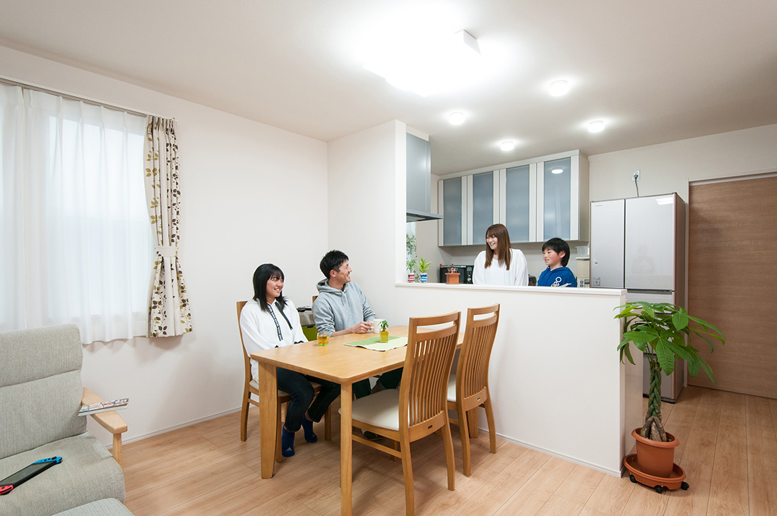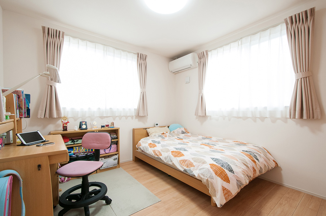 東日本大震災の時、奥様は揺れで怖い思いをした上、自衛官のご主人は何週間も帰宅せず不安だったとのこと。「フェニーチェホームは警察署の建物と同じぐらい頑丈という説明を聞き、これだ!と‥」。こうして、プランは奥様が中心に進めました。太陽光発電も、震災時に装備しているお宅でお世話になった経験を踏まえた重要ポイント。間取りは、「子ども部屋の広さは6畳以上、1階に別室も設けたい」との要望でした。 完成したのは、空間を有効に活用した強い住まい。「内外の明るい壁色や木の風合いが好みです」と話すご主人は、白木の家具を吟味し調和を図ったとのこと。「実際に住んでみても、この家は地震の揺れが少ないし、暖かいと感じます。自分が不在でも家族を守ってくれますね」と、頷かれました。