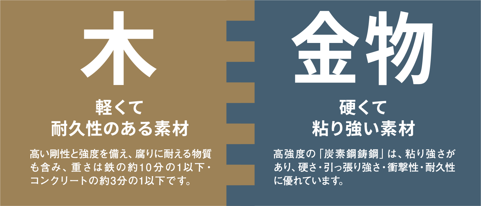 接合用金物は、厚さ6㎜の高強度の「炭素鋼鋳鋼」で、粘り強さがあり、硬さ・引っ張り強さ・衝撃性・耐久性に優れ、車両部品や原子力部品高圧バルブなど精密かつ耐久性を求められる部品に多く使用されています。