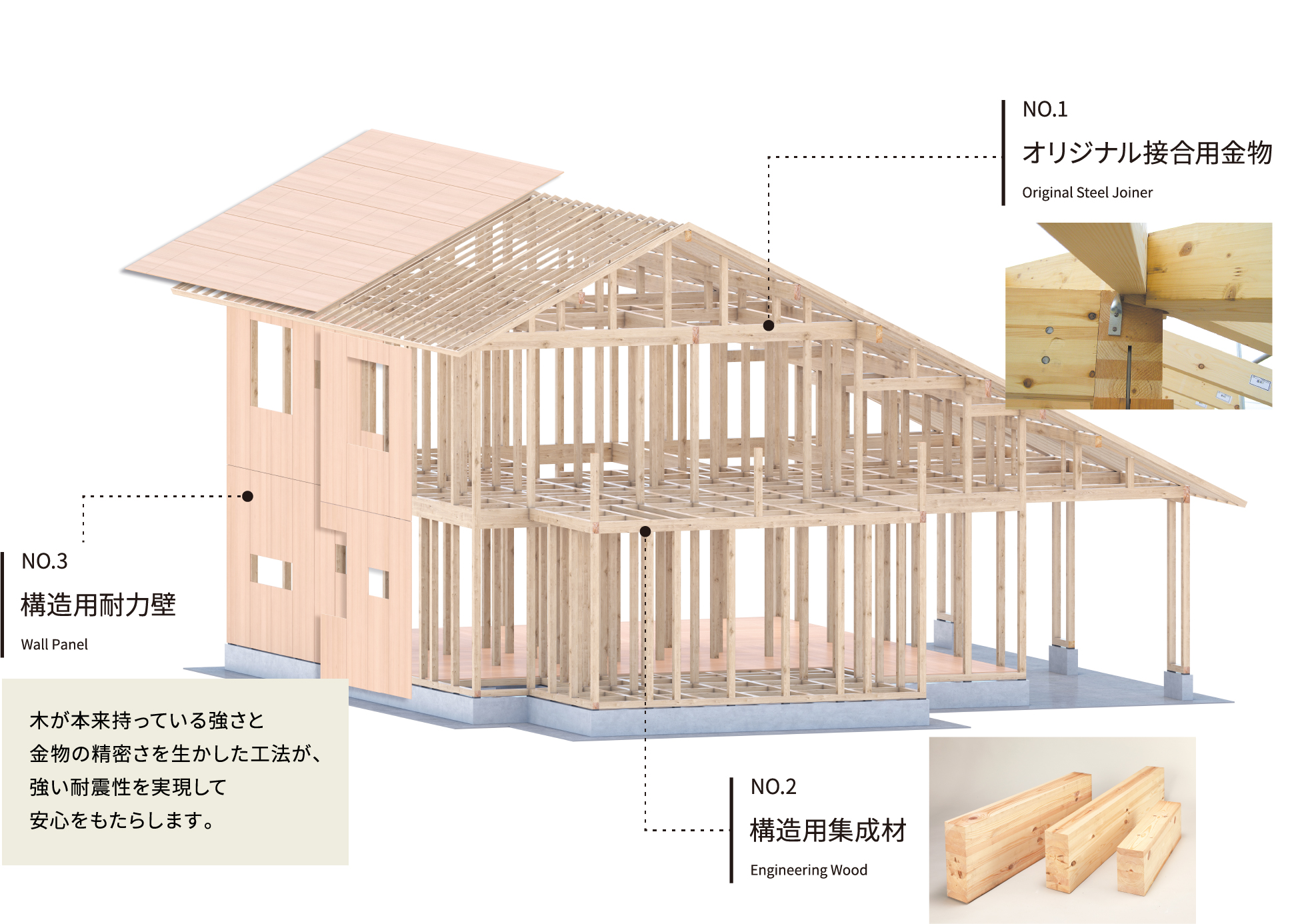 点と面、両方で建物を支える、優れた性能を発揮する新・木造軸組工法です。