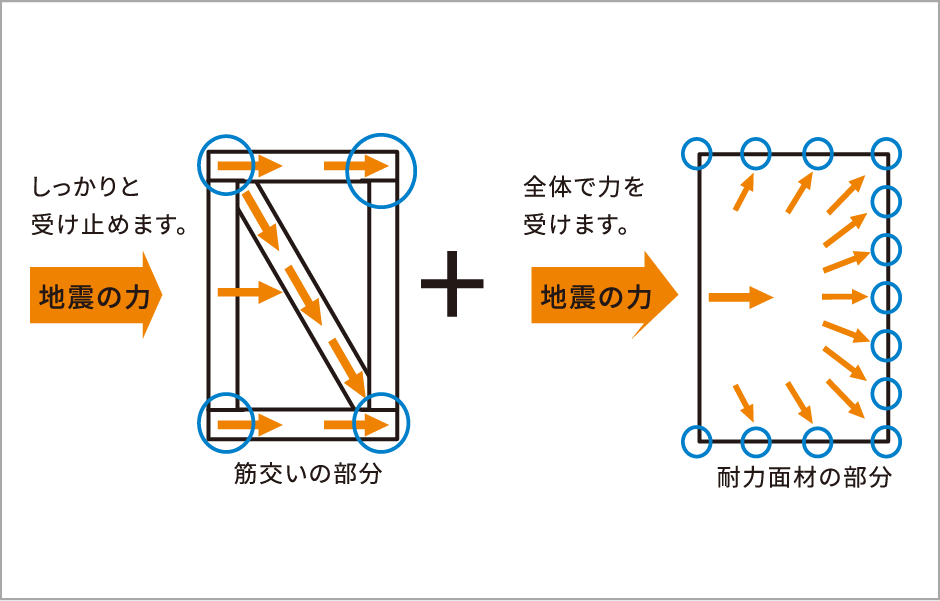 耐力面材で、柱・床・土台を一体化し、ひとつの箱状とすることで、建物にかかる力を全体的に分散し、外力に効果的に抵抗します。建物への力が一点に集中せず、衝撃を和らげることができます。また「筋交い+構造用耐力壁」とパワービルド専用接合金物による強固な接合を採用することで、住まいの耐震性や耐久性を格段に向上させました。