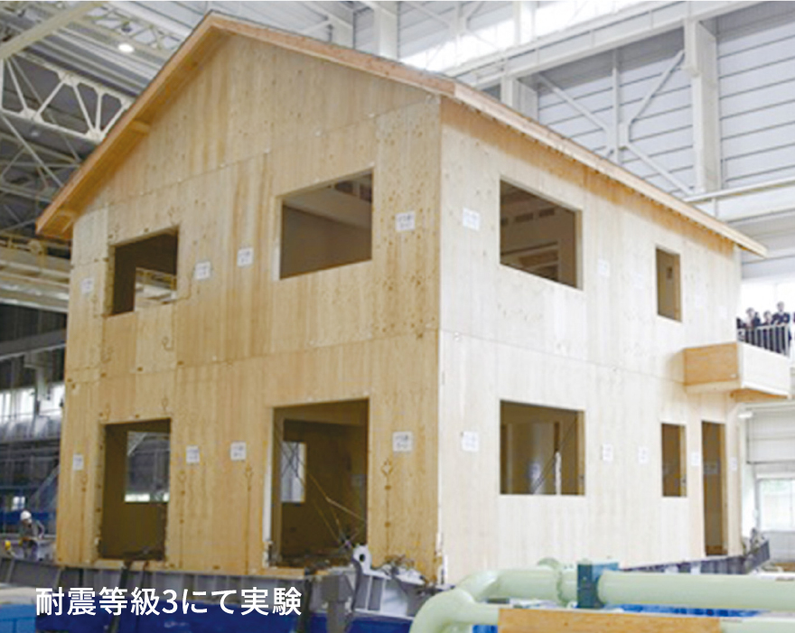 財団法人建材試験センターが主催する「木質構造建築物の振動研究会」において、工学院大学建築学科・宮澤健二教授の指導のもと、パワービルド工法の実大振動実験が行われました(2006年5月26日、独立行政法人土木研究所にて)。その結果、阪神・淡路大震災の1.25倍※の振動を与えても倒壊しない十分な耐震性能を発揮することが実証されました。